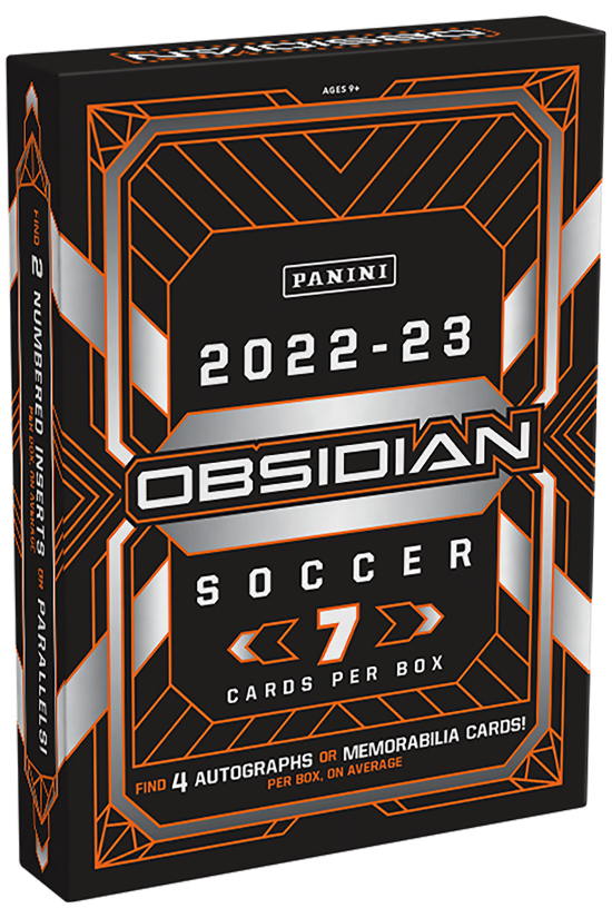2022-23 Panini Obsidian Soccer is a premium release that combines both club and national teams under one umbrella. The set includes a mix of base, parallels, autos, relics, and inserts. The Obsidian brand is well known for its black cardstock, which is accented by bright colours. Some of the biggest names in the sport are included, such as Beckham, Messi, and Ronaldo, all of whom have signed cards included. Hobby boxes offer 4 hits each, and a full player-by-player breakdown can be found at Breakninja.com.