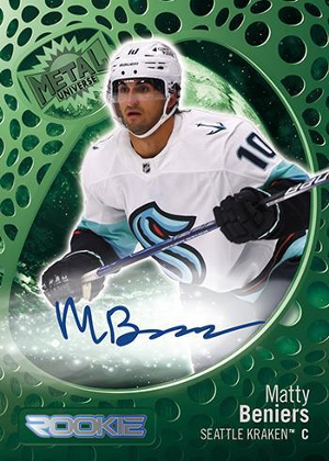 2022-23 Skybox Metal Universe is a hockey card release that includes some of the flashier designs of the season. The release is well known for its space themed backgrounds, as well as iconic sets such as Precious Metal Gems, and Jambalaya, both of which return for another year. The set features a mix of base, parallels, autos, and inserts, but signed cards are not a guarantee, instead falling 1 in every 2 boxes on average. Fans can look for top name rookies such as Shane Wright and Juraj Slafkovsky, as well as fan favorite Arber Xhekaj. A full team-by-team breakdown of the set can be found at Breakninja.com.