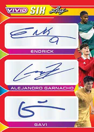 2022 Leaf Vivid is an all autographed soccer release that brings bright neon colours to the hobby. Featuring an array of top name players, the set offers single, double, triple, and 6-way signed cards, all set against a bold colour card stock. As can be expected from a Leaf release, the autographs are sticker signed, but still should offer decent market value. Collectors can expect a total of 4 signed cards in every box, including a guaranteed multi-signed card. A full player-by-player breakdown can be found at Breakninja.com.