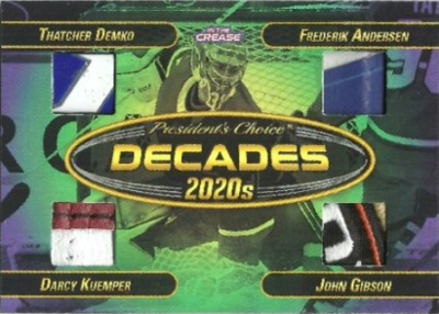 2022 President’s Choice In The Crease is a premium style hockey release that only offers game-used relic cards. The set is seen as a premium successor to the popular Between the Pipes set from ITG, which saw success in the mid-late 2000s and early 2010s. Both the defunct ITG and new President’s Choice companies are the brain child of Dr. Brian Price. Boxes offer a total of 4 cards each with no card being numbered higher than 10, and just over 50% of boxes offering a 1/1. A player-by-player breakdown can be found at Breakninja.com.