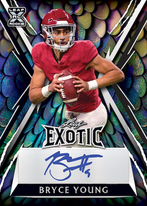 2023 Leaf Exotic Football is a release that mixes NCAA prospects and NFL stars into one release. The design of the cards includes animal prints and comes in different versions such as prismatic, crystal. and mojo. The release includes players such as Bryce Young, Justin Herbert, and Joe Burrow, and all signed cards appear to be sticker signed. Hobby format boxes offer 3 signed cards each, and a full player-by-player breakdown can be found at Breakninja.com.