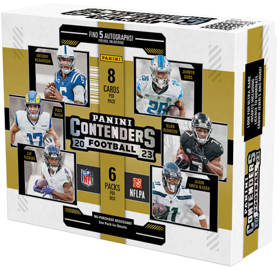 2023 Panini Contenders Football is a classic release that has a huge following in the hobby. The brand is best known for its Rookie Ticket autograph cards, which offer autos of the top players in the 2023 rookie class, with several of these being hard-signed options. Additionally there is a base set with parallels, additional autograph sets, relics, and inserts, as well as a selection of update sets from previous Contenders releases. Hobby format boxes promise 1 on-card auto, as well as 4 other autos. A full team-by-team breakdown can be found at Breakninja.com.