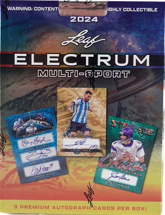 2024 Leaf Electrum is marketed as a multi-sport release but a closer look reveals that it is so much more. The set basically brings a traditional multi-sport set and marries it with the glitz and glam of Pop Century. There is a heavy dose of celebrity auto content added into the sport lineup. Cards also look to be fairly attractive, and while sticker autos are always a disappointment, it is something that Leaf fans are used to. Boxes are limited to just 3 cards each, with all cards being signed. A full name-by-name breakdown can be found at Breakninja.com.