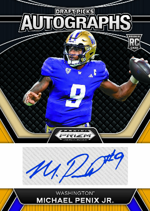 2024 Panini Prizm Draft Picks Football brings top level talent at both the pro and collegiate levels. All cards feature players in their college uniforms, including a mix of rookies, stars, and even retired legends. The set takes much the same design cues as the main Prizm Football release, offering a chromium finish, a sizeable base set, multiple parallels, autos, and inserts. Hobby boxes offer 4 hits each, working out to 1 auto per pack. A full breakdown of the release can be found at Breakninja.com.
