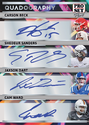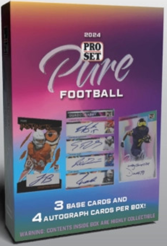 2024 Pro Set Pure Football is an attractive release that combines base and autographs into one release. Like most Leaf releases this is an unlicensed brand, meaning that NFL and team logos will not be visible on the cards. Long time hobbyists will know Pro Set as the bottom of the barrel brand that defined the early 90s era of overproduction, however this revived version moves Pro Set to a more premium level. Hobby boxes offer 7 cards each, including 4 that offer autographs. A full player-by-player breakdown of the release can be found at Breakninja.com.