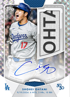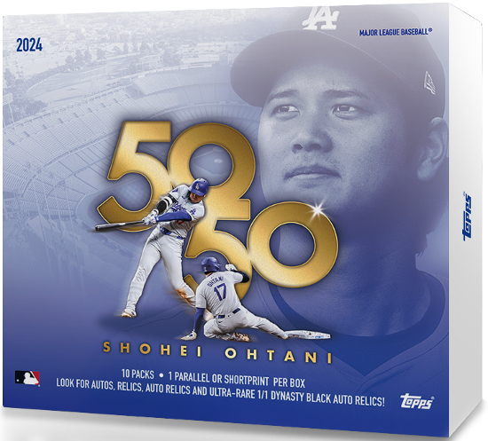 2024 Topps 50/50: Shohei Ohtani is a special release baseball set that was released exclusively on the Topps website. The release is in celebration of Ohtani’s legendary season in which he became the first player to have both 50 home runs and 50 stolen bases in the same season. The set consists of a base set that includes 1 card for each homer and each stolen base. There are also parallels and SSP versions of the base set, as well a small selection of autos, relics, and rare Dynasty Auto Relics, each of which is numbered 1 of 1. A breakdown of the set can be found at Breakninja.com.